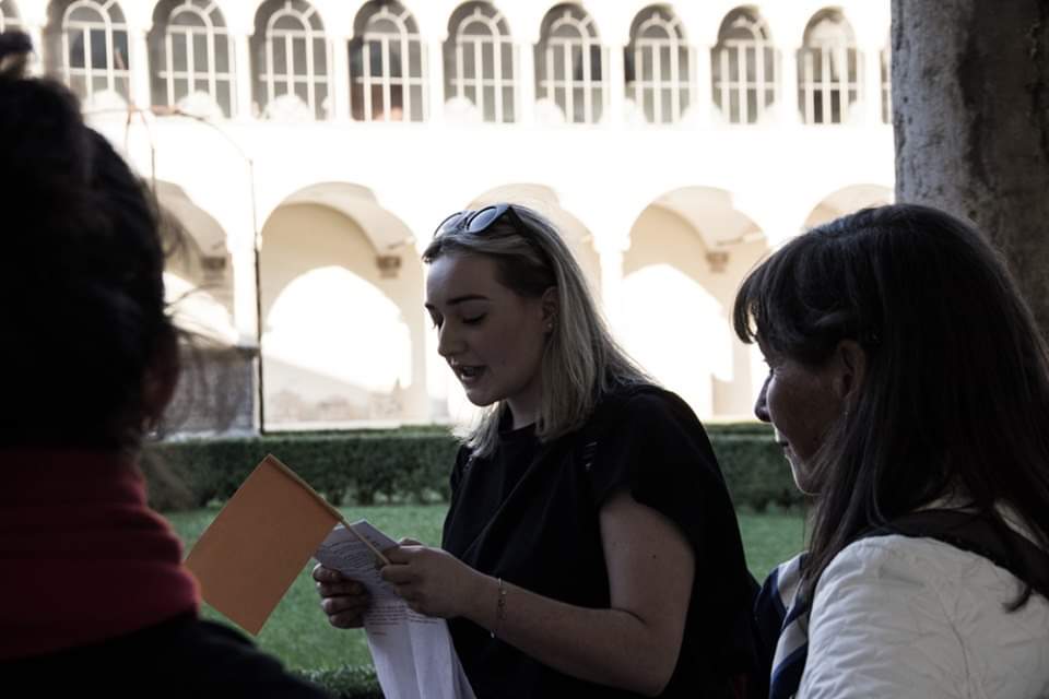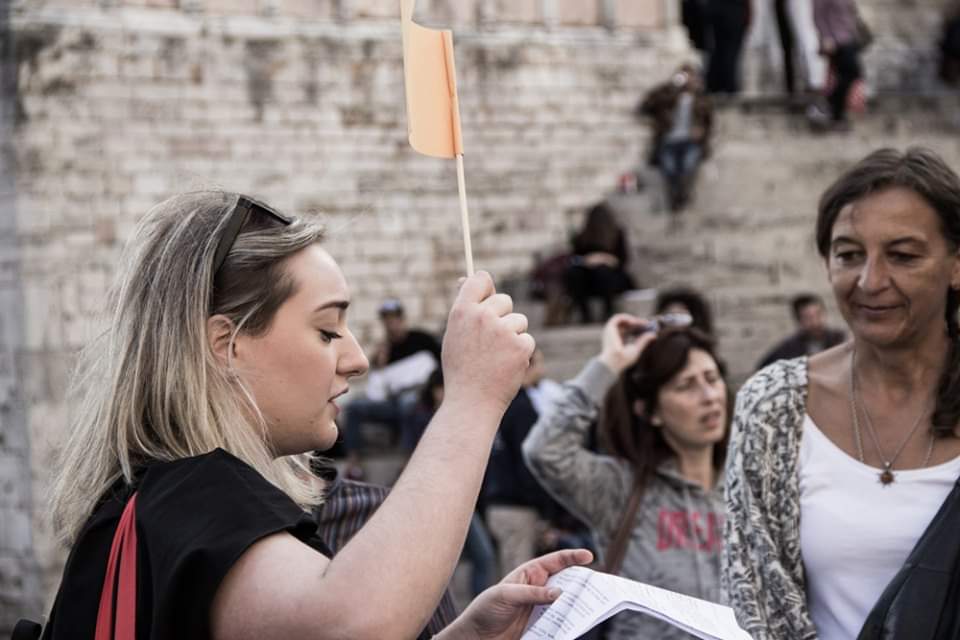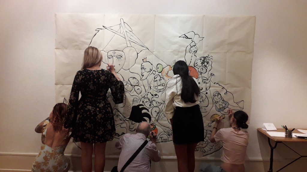 The city of Perugia is a historical city, known for its landmarks. I therefore imagined a fake guided tour of the city that would take the participants through a city walk in six different places. The imagined text was inspired by the real history of each place. To these stories was added the tale of a group of travelers from an ancient time, who dreamed of making a great journey, moving from one point to another. A spiritual journey to conquer a better future … The coveted land was almost a mirage, a land unattainable (a parallel with the Eldorado that is Europe for the Harakkas). The performance ended with an ultimate test to unsettle them, challenge what they feel and experience, as individuals and part of a larger group. They find me in front of a huge cooking pot filled with fish soup, that I invite them to consume in silence, before inviting them to draw the mural together.