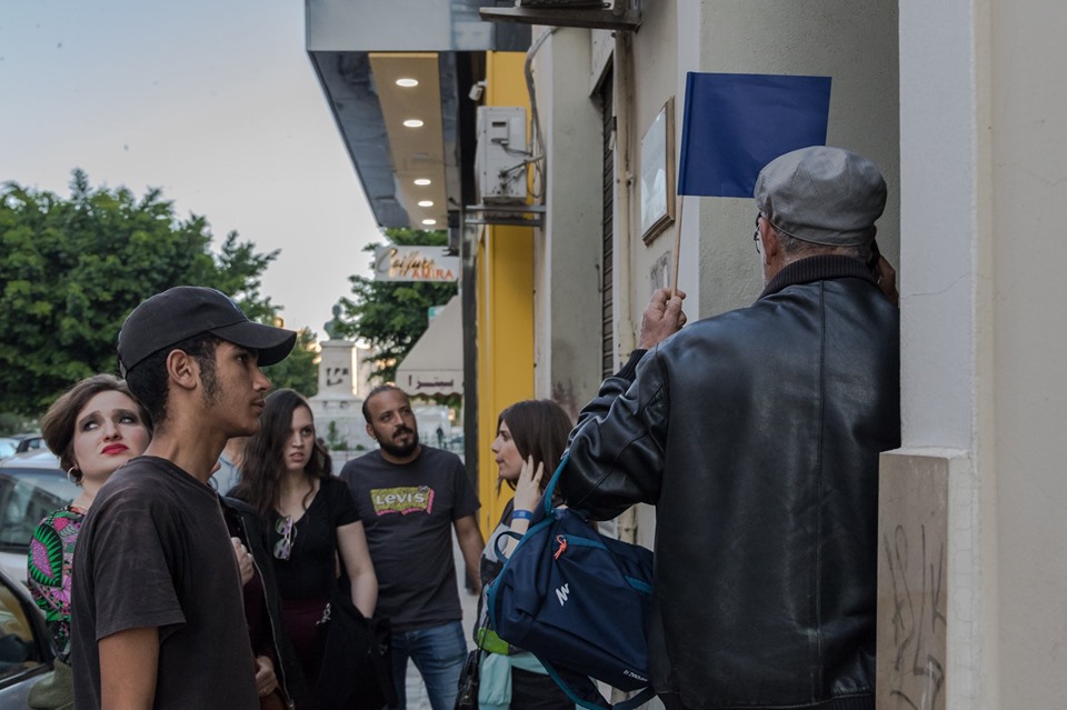 What they didn’t know was that this walk was a detailed account of a migrant’s journey across the Mediterranean to Europe. To materialize this journey, I had noted six points on a map: from the haraka’s home to the « ch9af » (the final boat). I wanted to physically engage the audience’s body, hungry from the ordeal of fasting, in a walk that would cross six places in downtown Tunis. Again, the intention was not to tell the death of the one hundred and forty travelers, but to celebrate the life, the rebirth of the sixty- eight survivors, without removing the emotional and political weight of the situation.