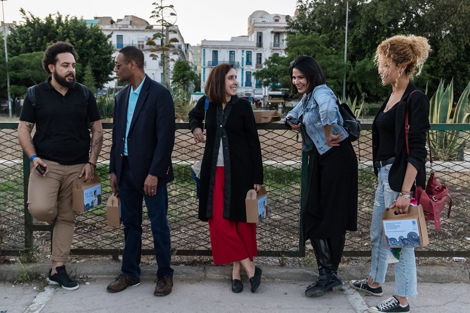 The second part, discussed here, is entitled « Blue Iftar », which i imagined as an immersive and participatory performance. This performance took place on June second twenty nineteen, on the one year anniversary of the sinking of the migrant boat in Kerkennah. We announced, with Central Tunis, the gallery that produced this performance, a surprise iftar (the breaking of fast dinner during Ramadan) with me. People had then paid for a dinner and found themselves part of an unexpected walk through the streets of Tunis that began an hour and a half before the actual Iftar time. Over one hundred people were taken on this mystery walk.
