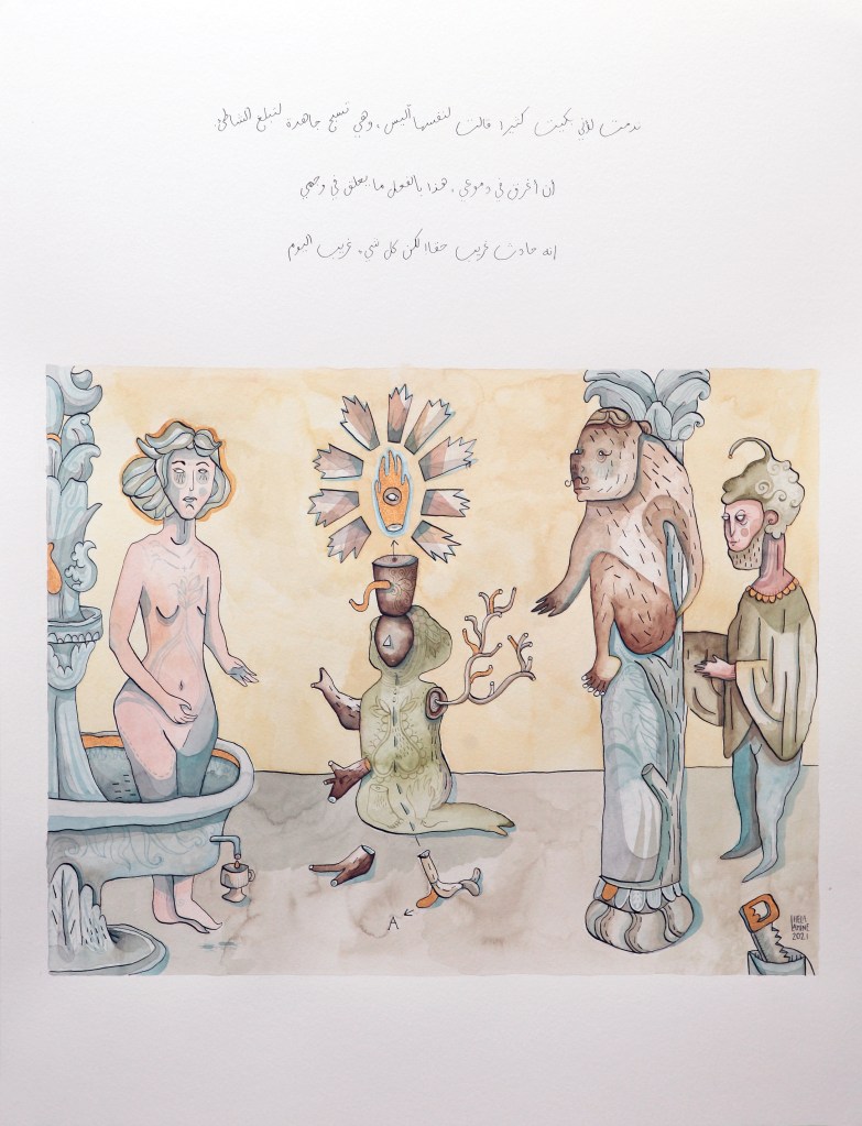 Alice à l'heure de l'éclipse // Alice at eclipse time 2021 It's only a dream Watercolor on paper 67x52cm Similar project : Link 1: https://helalamine.com/2019/07/29/mythologie-personnelle-dun-djin/ Link 2 : https://helalamine.com/2010/04/01/livres-dartiste/ Link 3 : https://helalamine.com/2020/07/29/quand-les-arbres-murmurent/