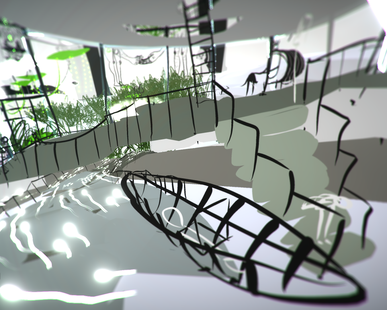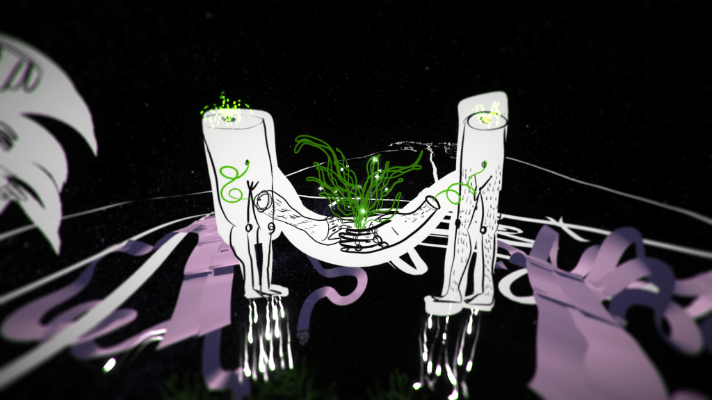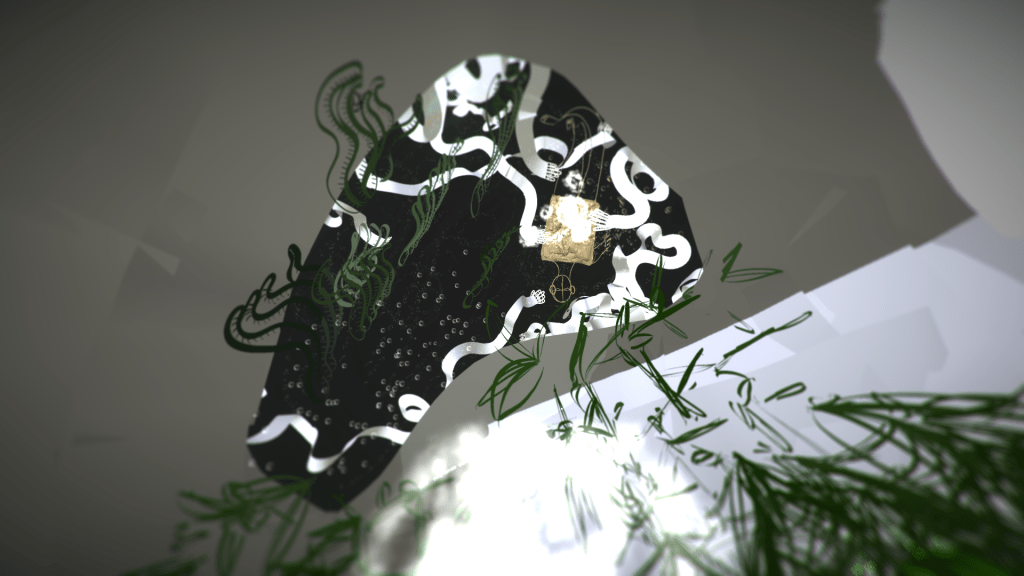 "The virtual reality experience titled "Still Life" immerses participants in a journey into the depths of an envisioned "living nature" created by the artist Hela Lamine, exploring transformation and adaptation as essential means of survival. Drawn line by line within the virtual reality headset, this environment comes to life in a studio-orchard in Mornag, Tunisia, where each element is connected by an invisible line symbolizing a kind of life force capable of interconnecting all living beings.